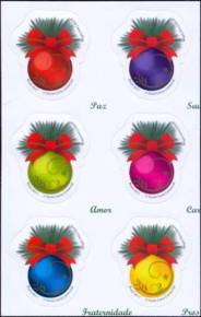 Selos Bolas: Assim como o selo Velas, também simpática criação de um dos principais símbolos natalinos. O ponto negativo fica para a disposição dos selos na folha, elaborada por quem não gosta dos filatelistas. Permite várias sextilhas em posições diferentes. Mesma crítica do anterior às palavras entre os selos. NOTA 3.