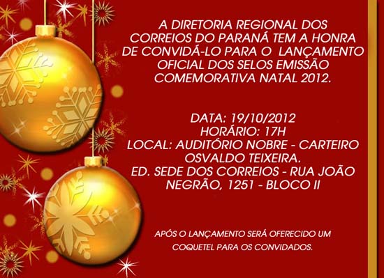 Amigos de Curitiba e cidades vizinhas, a diretoria regional dos Correios do Paraná convidam para a cerimônia de lançamento da emissão Natal 2012, que acontecerá na sexta-feira da próxima semana, 19 de outubro.