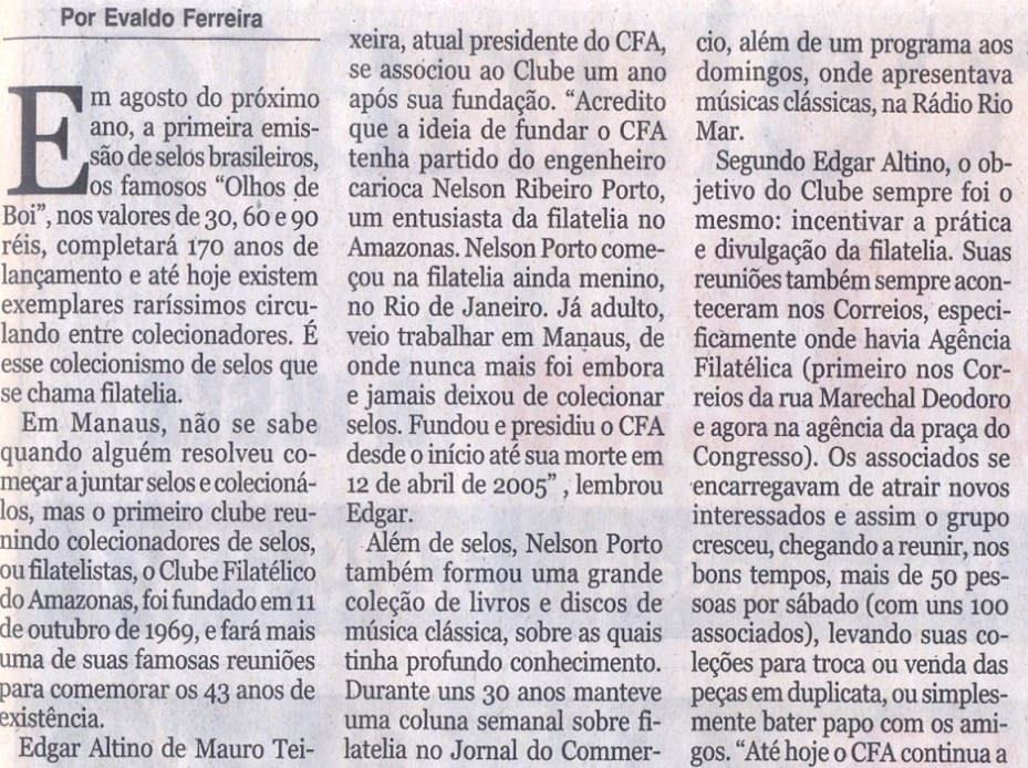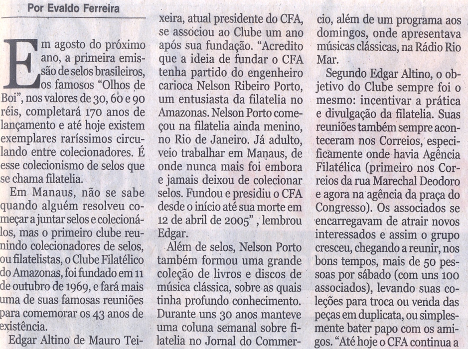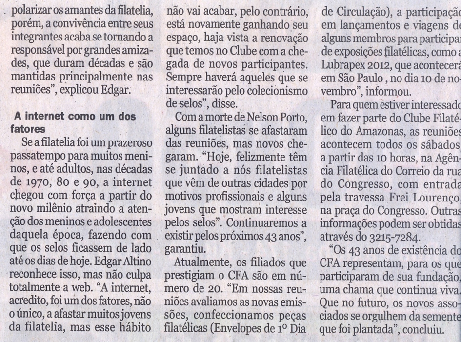 O amigo Edgar Altino Teixeira, presidente do Clube Filatélico do Amazonas, mandou matéria publicada no Jornal do Commercio, de Manaus, sobre os 43 anos da entidade. Segue abaixo…