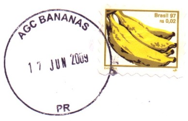 Segue abaixo um exemplo, fragmento de um envelope com o selo Banana da série Frutas, obliterado na Agência Bananas/PR.