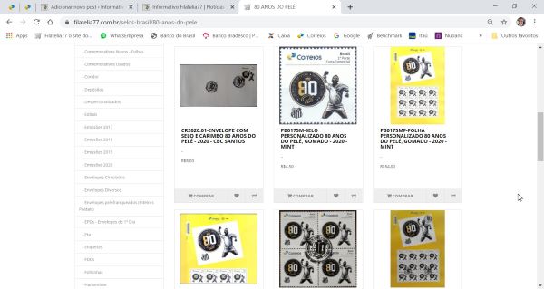 Temos na Loja uma seção temporária “80 Anos do Pelé”, onde vocês encontrarão todos os itens que colocamos a venda da mesma: selo, quadra e folha mint, quadra e folha com carimbo comemorativo de lançamento e envelope com o selo e carimbo.