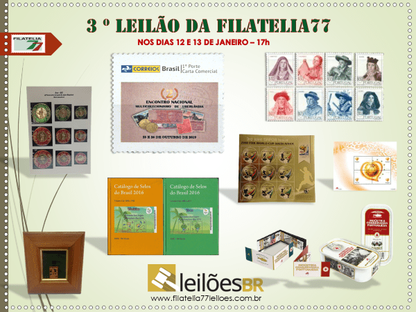 Nos dias 12 e 13 de janeiro (próximas quarta e quinta-feira) acontecerá o 3º Leilão da Filatelia77. Às 17:00h nos dois dias.
