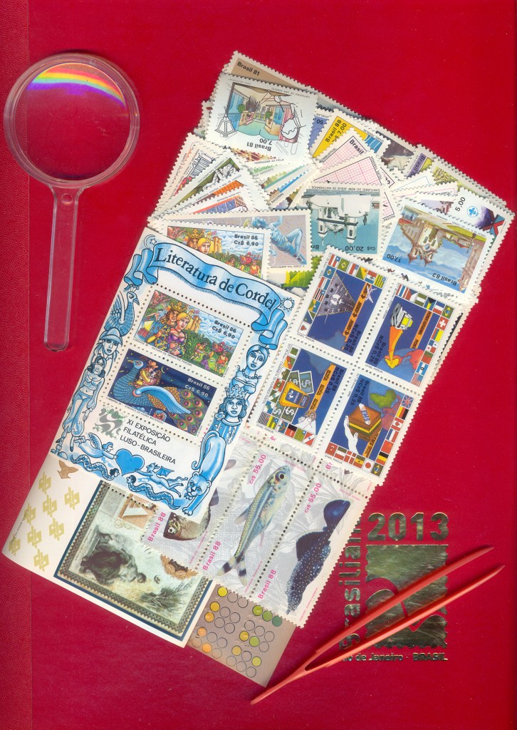 Contém um classificador grande de quatro páginas, lupa e pinça plásticas e um pacote com selos e blocos comemorativos do Brasil.