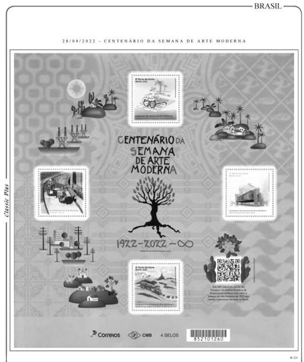 Formato grande (34,4 x 28cm), onde cabem todos os blocos inteiros, inclusive o exagerado “Centenário da Semana de Arte Moderna”, lançado em 2022.
