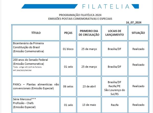 Os Correios atualizaram a programação filatélica 2024, vocês poderão verificar clicando na imagem abaixo.