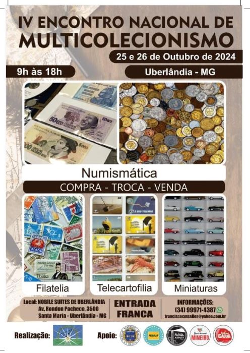 Organizado pelo Clube Filatélico e Numismático de Uberlândia, o IV Encontro Nacional de Multicolecionismo de Uberlândia acontecerá nos dias 25 e 26 de outubro, no hotel Nobile Suítes (Av. Rondon Pacheco, 3.500 – bairro Santa Maria).