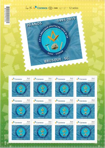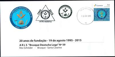 Por ocasião do 20º aniversário de fundação da ARLS “Brusque Deutsche Loge” Nº 59, de Brusque/SC, ocorrido no dia 19 de agosto, foi lançado um selo personalizado durante jantar festivo ocorrido no dia 22.