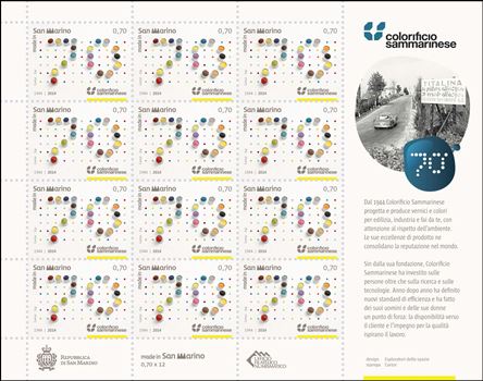 Em 17 de março os Correios de São Marino lançaram o selo comemorativo “70º Aniversário da Colorificio Sammarinese”. Com valor facial de € 0,70, a tiragem foi de 70.008 unidades, impressas em folhas de 12 selos com faixa descritiva à direita.