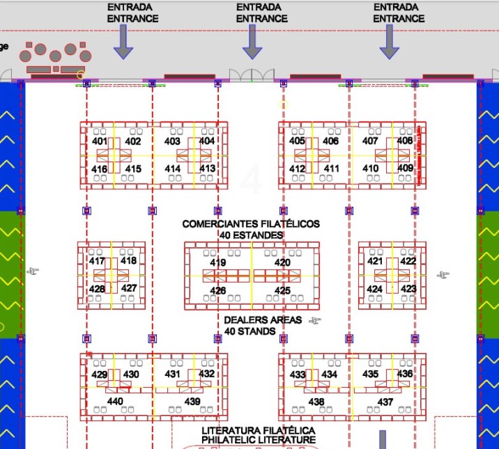 Como já comentei, eu e o Thiago estaremos lá, e esperamos receber a visita de muitos amigos. Dividiremos um grande estande central com o amigo Cláudio Neumann, da Neumann Filatelia – vejam no mapa que segue abaixo, do salão de comércio filatélico: estaremos no estande 420.