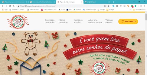 As datas e locais para adoção das cartas variam conforme o Estado e podem ser conferidas no blog da campanha Papai Noel dos Correios – cliquem na imagem abaixo para acessá-lo.