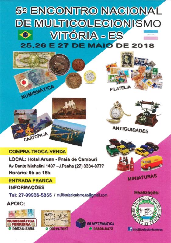 Organizado pela Sociedade Capixaba de Multicolecionismo, o 5º Encontro Nacional de Multicolecionismo de Vitória acontecerá de 25 a 27 de maio, no Hotel Aruan (praia de Camburi, endereço no banner).