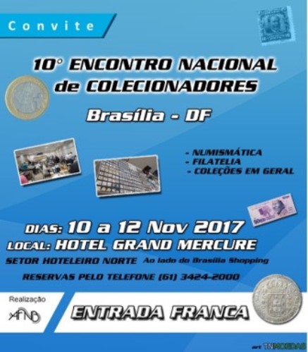 A AFNB – Associação Filatélica e Numismática de Brasília está organizando o 10º Encontro Nacional de Colecionadores de Brasília, que acontecerá de 10 a 12 de novembro, no mesmo local dos anteriores: Hotel Mercure (endereço no banner abaixo).