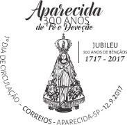 Em 12 de setembro os Correios lançaram, em Aparecida/SP, o selo comemorativo “Aparecida 300 Anos de Fé e Devoção – Jubileu 300 Anos de Bençãos 1717-2017” e em 12 de outubro lançarão, no mesmo local, um bloco que comporá a mesma emissão.