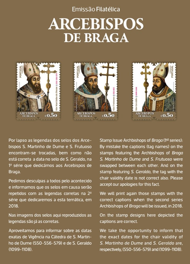 Na edição anterior comentei sobre alguns erros cometidos pelos CTT – Correios de Portugal na emissão “Arcebispos de Braga”. Agora, segue abaixo o comunicado oficial dos CTT sobre os erros: