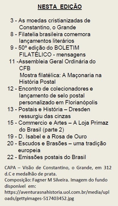 Eu não me canso de rasgar elogios ao Boletim Filatélico do Clube Filatélico Brusquense, caprichosamente editado pelo amigo Jorge Paulo Krieger Filho e equipe.