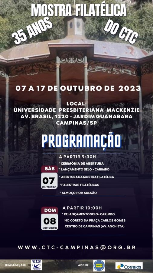 No dia 7 de outubro teremos a cerimônia de abertura da Mostra Filatélica comemorativa dos 35 anos do CTC – Centro Temático de Campinas. Endereço e programação no banner abaixo.