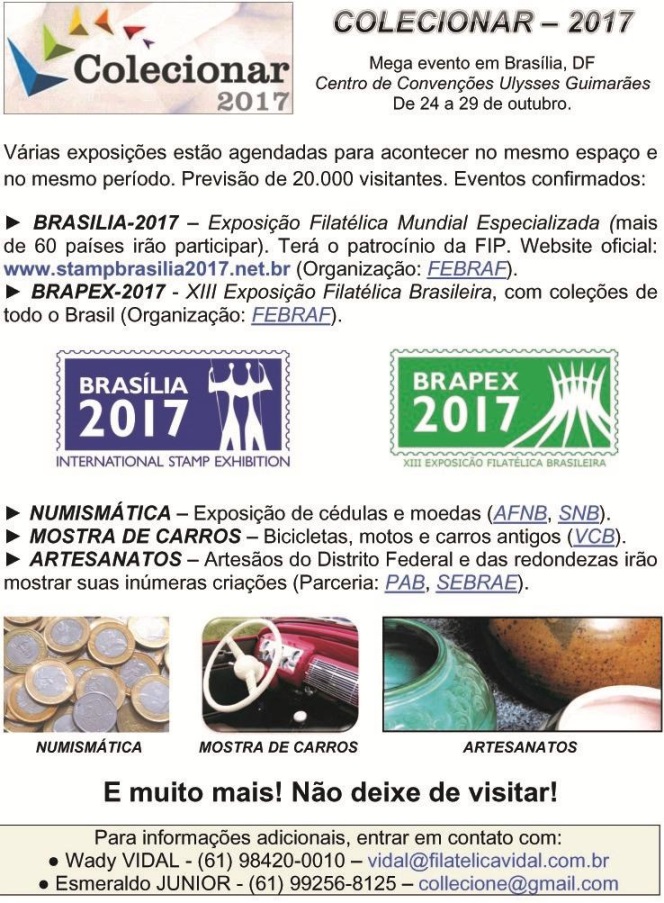 O maior evento filatélico e de multicolecionismo do país este ano acontecerá na capital federal, de 24 a 29 de outubro. Vejam a divulgação abaixo…