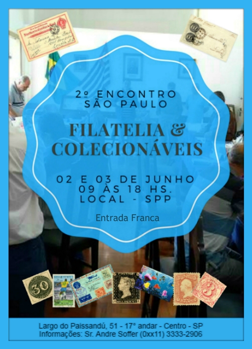 Os amigos André Soffer e Luiz Amato estão organizando o 2º Encontro São Paulo de Filatelia e Colecionáveis, que acontecerá nos dias 2 e 3 de junho, na sede da SPP – Sociedade Philatelica Paulista – Largo Paissandu, 51 – 17º andar.