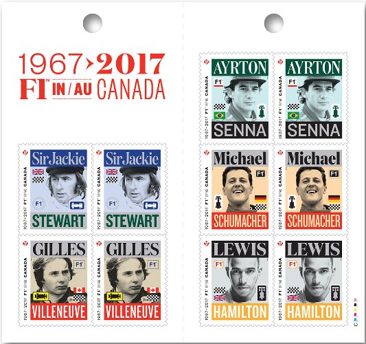 Ayrton Senna é um dos cinco pilotos homenageados pela Canada Post, empresa responsável pelos serviços postais do Canadá, em uma série lançada na segunda-feira 15 de maio, em comemoração aos 50 anos da primeira corrida de Fórmula 1 realizada no país.